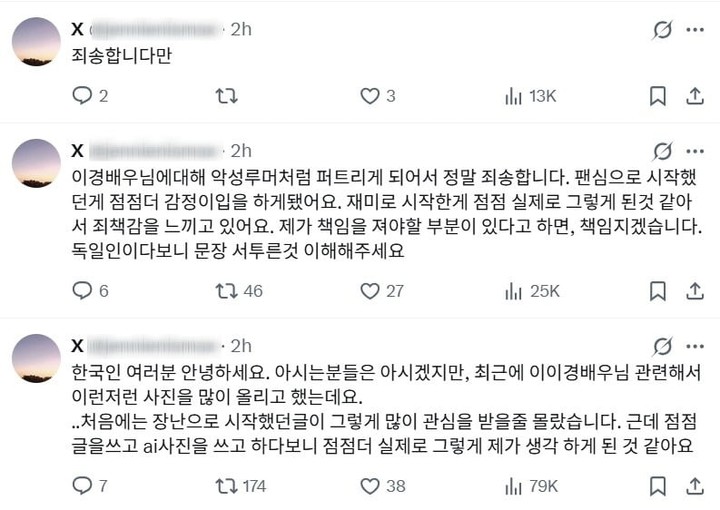 지난 22일 오전, A씨는 자신의 엑스(X·옛 트위터) 계정에 사과문을 게재했다. 그는 "장난으로 시작했던 글이 그렇게 많은 관심을 받을 줄 몰랐다"며 "점점 글을 쓰고 AI 사진을 쓰다 보니 점점 더 실제로 그렇게 제가 생각하게 된 것 같다"고 고백했다.